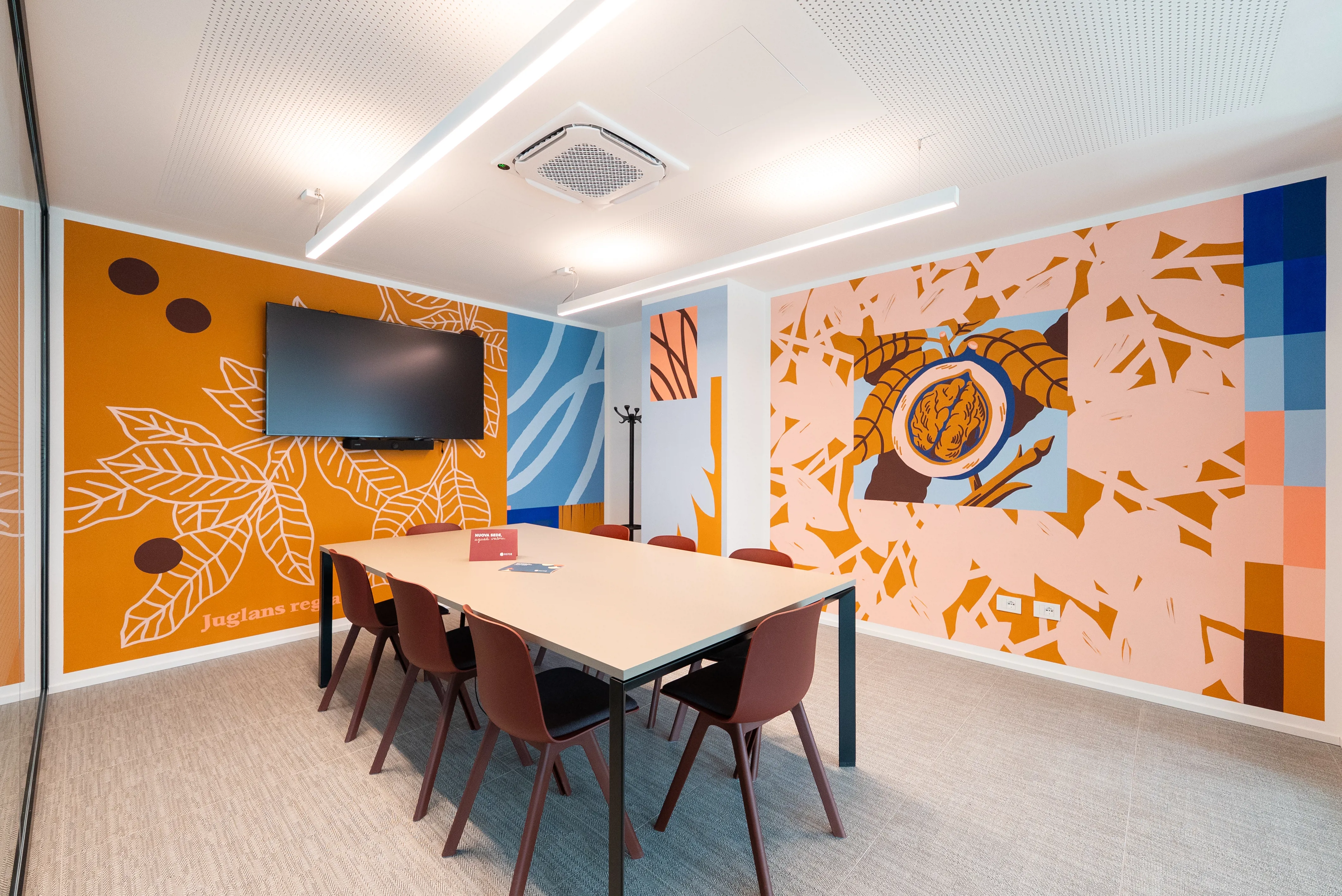 L’ispirazione nasce dalle illustrazioni che abitano le sale riunioni del nuovo Risto3 hub: Zafferano, Anice, Timo, Noce, Ulivo e Cedro, elementi naturali reinterpretati dall’artista Luogo Comune. Ogni nome richiama un elemento nobile della natura, evocativo e ricco di significato: radici che custodiscono memoria, frutti che parlano di identità, profumi e colori che evocano tradizione e innovazione. Sono immagini semplici nella forma ma dense di significato, capaci di rappresentare l’essenza di Risto3 hub: un luogo che cresce e guarda avanti.